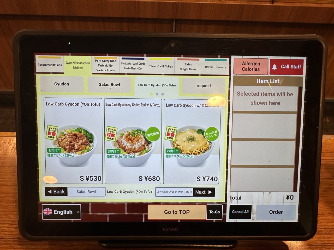 First, Sukiya is a famous gyudon (steak-rice bowl) franchise, and there are a few ways to stay diet-conscious here. First, you can get any beef bowl in a “mini” size. Next, with any meal, you can get a side salad or pickle dish (or both). On top of that, they have meal-size salads, a rarity in Japan. Finally, they have a few “low-carb” options where you can switch the rice out for tofu, so you essentially end up with beef-topped tofu. It’s tasty!